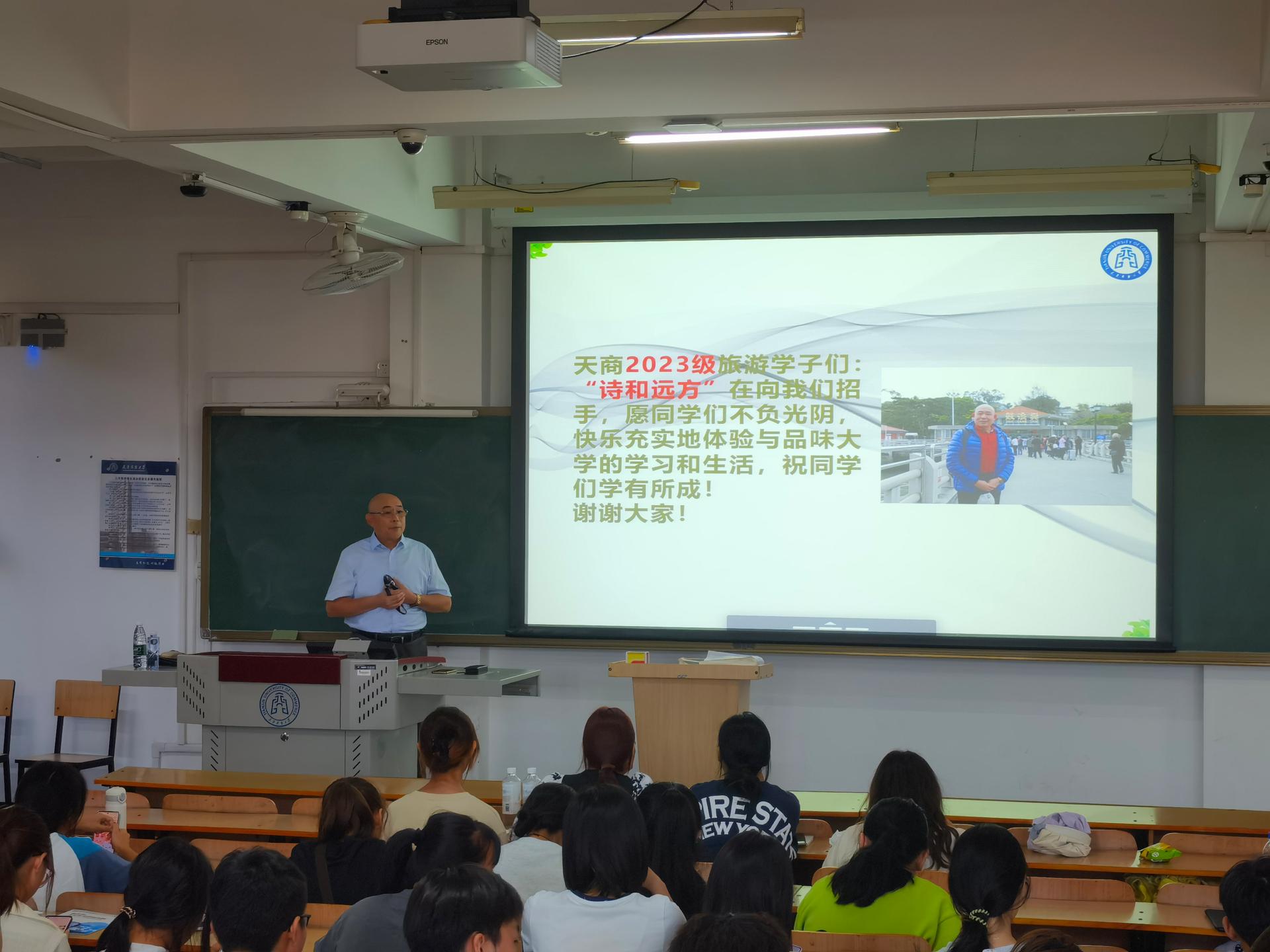 9月22日下午,公司经理王庆生在三教502室,为2023级员工作题为“旅游人的情怀:诗与远方”的专业认知讲座,辅导员梁燕、杨文喜及2023级旅游管理类全体员工参加。